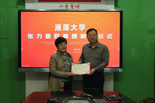 下午4点在湘潭大学机械工程学院会议室举办了张力教授的受聘仪式,张力教授被特聘为湘潭大学机械工程学院兼职教授,机械工程学院丁琰书记为张力教授颁发了聘书,到场的人员还有机械工程学院周友行副院长、工业设计系姚湘教授、李江泳系主任、傅燕翔副教授和部分学生。