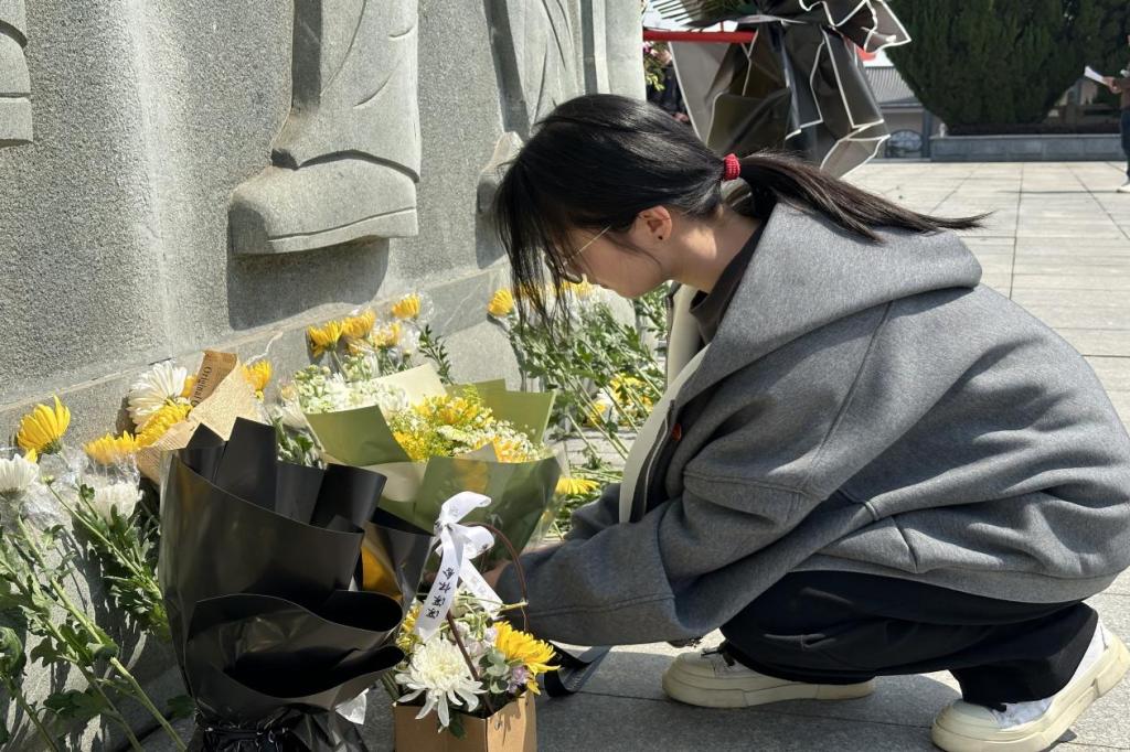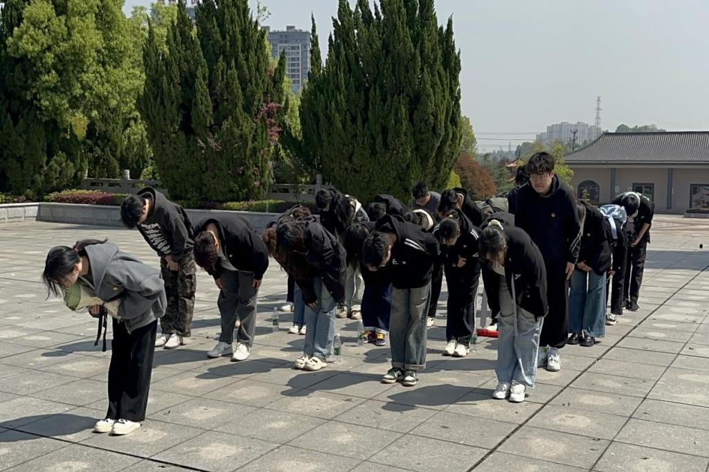 在烈士纪念碑前,全体成员身着素装,队列肃立,垂首默哀三分钟,向为国家和人民献出生命的英烈致以最深切的哀悼。默哀结束,学生代表毛欣然缓步向前,向烈士纪念碑敬献鲜花。全体成员深鞠三躬,行庄严鞠躬礼。