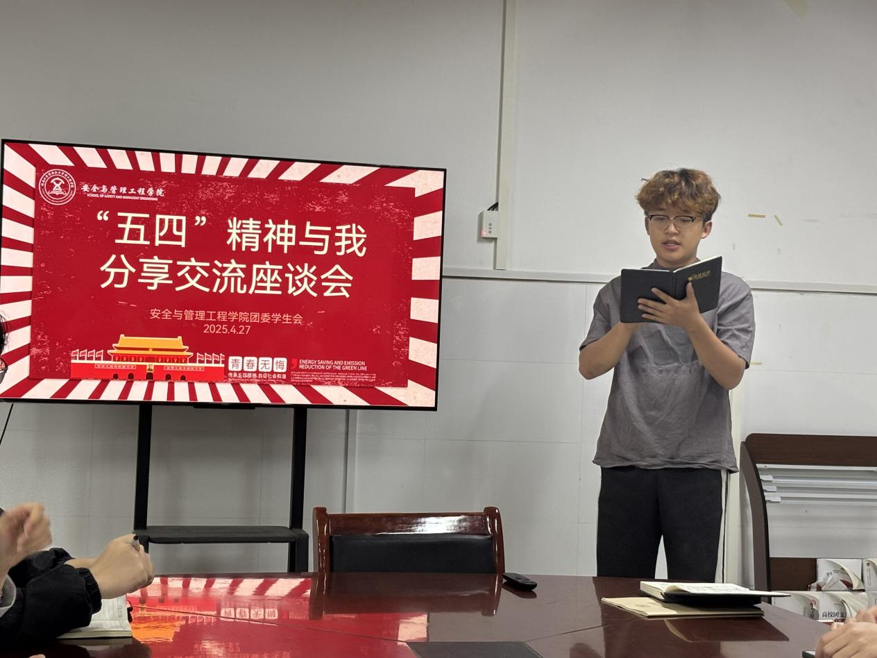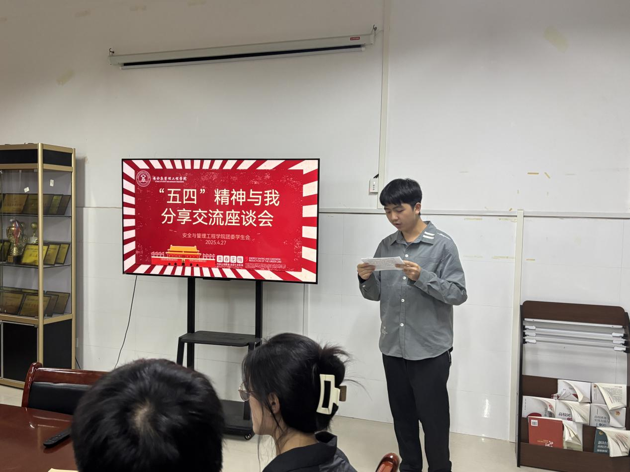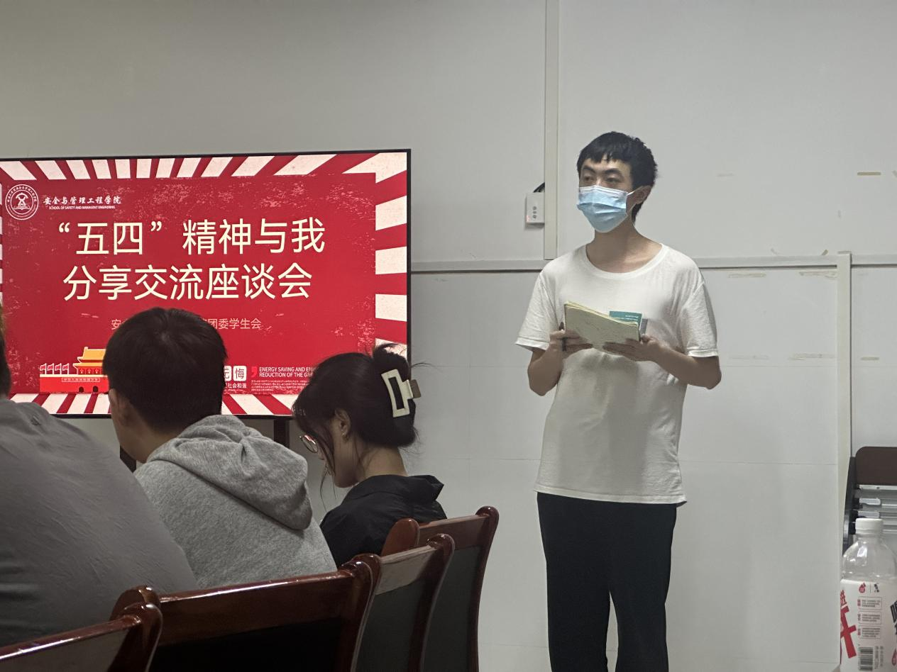为传承和弘扬五四精神,激发青年学子的责任感与使命感,安工学院于4月27日下午在5214举办了“五四精神与我”为主题的交流分享座谈会。院团委书记蒋昂松和第十七届团委学生会全体干部齐聚一堂,共话五四精神,分享青春感悟。