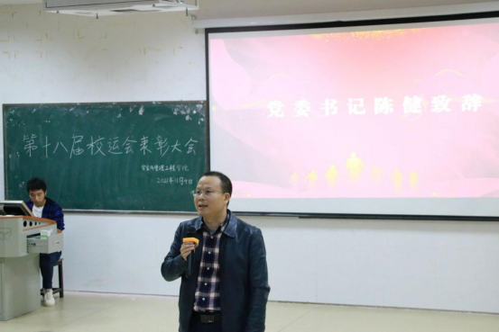 大会伊始,与会人员通过影集视频回顾了校运会期间的精彩瞬间。随后,陈健作开场致辞。他首先祝贺我院在第十八届校运会中取得优异成绩,同时对全体运动员和工作人员的精彩表现与辛勤付出表示赞扬和感谢。最后,他希望同学们将“更高、更快、更强、更团结”的体育精神融入到学习和生活中去,做一名德智体美劳全面发展的新时代大学生,并用自己的行动带动身边的同学一起成长、共同进步。