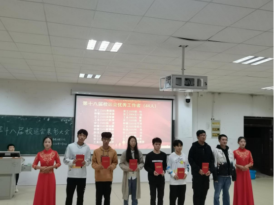 黄宏格宣读了《安全与管理工程学院关于表彰第十八届校运会先进集体和先进个人的决定》。与会嘉宾分别为获奖运动员、优秀运动员、国旗队优秀教官、方阵队优秀队员、优秀工作者以及优秀班级代表颁奖并合影留念。