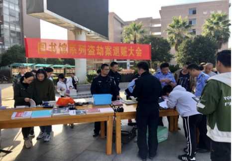 为展示严打整治效果,推动“扫黑除恶”行动向纵深发展,10 月 31 日下午,酃湖派出所在学校卓越广场举行“图书馆系列盗窃案现场退赃大会”。酃湖派出所所长刘杰、副所长岳聃、袁策 ,校党委委员杨朗、图书馆馆长宋楚华、党总支书记匡钰、保卫处处长陆琼、学生工作部副部长周燕斌等出席退赃大会。