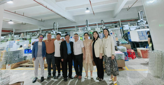 在东莞市万塑成塑料有限公司,一行走访生产车间和实验室,详细询问企业产品研发和市场表现,双方就人才引进、博士工作站建设等达成初步合作意向。