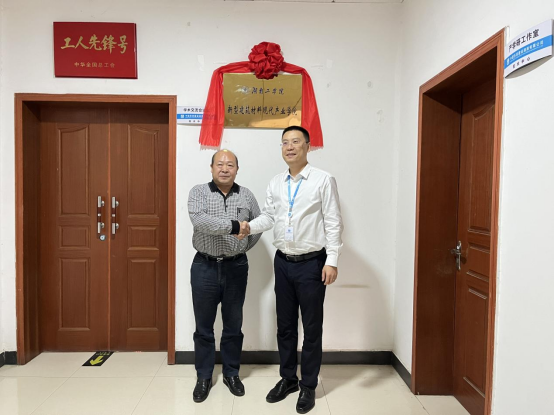刘升学一行参加WilliamHill中文官方网站新型建筑现代产业学院挂牌仪式,刘升学和中建西部建设湖南有限公司副总经理、总工程师蒋震共同揭牌。
