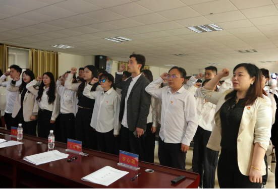 刘赢时领誓,全体新发展党员面向党旗庄严宣誓,与会师生党员共同重温入党誓词。
