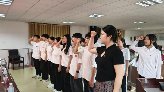 罗心阳为13名新发展团员一一佩戴团徽,并带领新团员入团宣誓,老团员重温入团誓词。