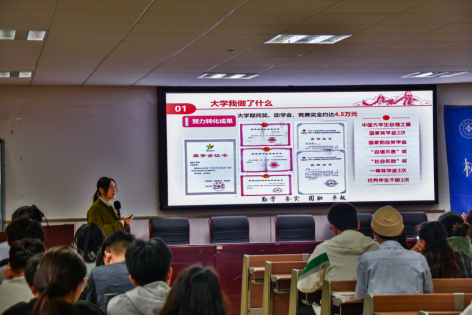尹惠、李增祎分别宣讲自己的优秀事迹。尹惠同学用“向下扎根,向上生长”为主题,分享自己在学习、团学会、志愿服务和求职等各个方面的故事。倡议团学干部走在前面,积极进取。李增祎同学回顾大学四年的得与失,鼓励大家勤学肯干,积极参与活动及竞赛,展现青春风貌。