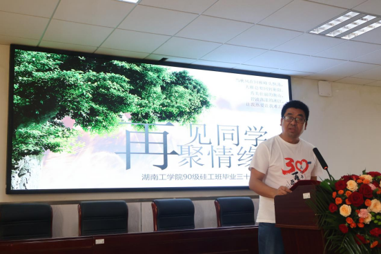 90硅工1、2班班主任熊铭奇、王安平先后讲话,饶有兴致地回忆起了昔日与同学们一起在校园共同度过的美好时光,寄语校友们要有大格局,踔厉奋发、勇立潮头,为祖国继续健康工作三十年。