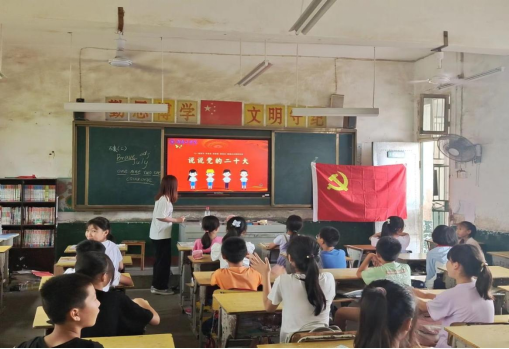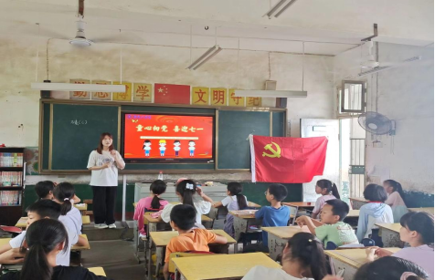 在党的102岁生日来临之际,为全面深入学习贯彻党的二十大精神,实施全环境立德树人,引导广大青少年儿童从小听党话、颂党恩、跟党走,让红色基因、革命薪火代代传承。WilliamHill中文官方网站材料科学与工程学院赴衡阳市珠晖区茶山坳镇“护绿水青山,助乡村振兴”暑期社会实践团于6月30日上午来到茶山小学开展“童心向党,喜迎七一”宣讲活动。