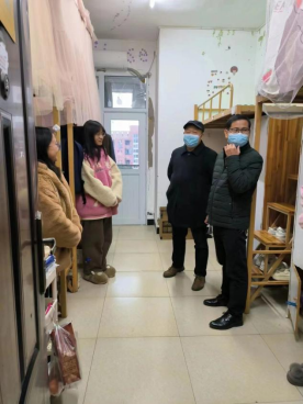 在走访学生寝室的过程中,刘升学与同学们进行了近距离、面对面交流,耐心询问大家的学习、生活及心理情况,了解学生离校的安排并帮助解答困惑。面对当前疫情形势,刘升学要求同学们疫情期间严格遵守学校的相关防疫规定,时刻保持疫情防控意识;应对寒冬降温天气,他提醒学生注意防寒,保持身体健康;针对宿舍卫生情况,他叮嘱同学们要养成良好的生活卫生习惯,共同营造干净整洁的学习生活环境。