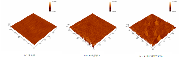 图1 玻璃表面K+离子嵌入前后及镀膜后的表面形貌