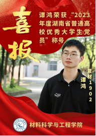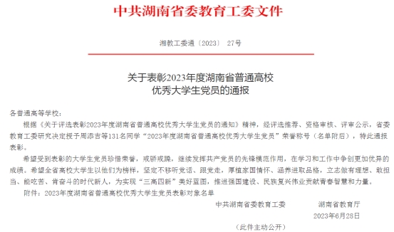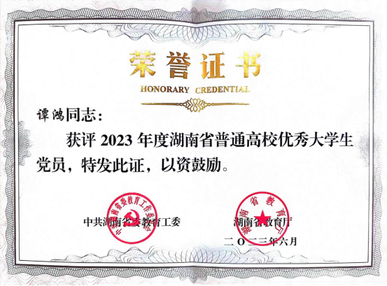 6月28日,中共湖南省委教育工委、湖南省教育厅发布《关于表彰2023年度湖南省普通高校优秀大学生党员的通报》,我院2019级学生谭鸿获此殊荣,受通报表彰。