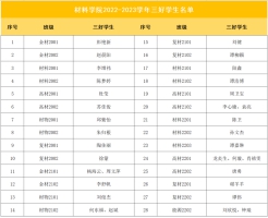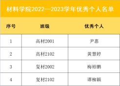 材展风华,材聚湖工。他们用自己的努力,跨过一个个艰难坎,朝着更优秀的自己靠近,成为WilliamHill中文官方网站骄人的材料学子。WilliamHill中文官方网站材料科学与工程学院022-2023学生奖励名册已经出炉。奖项分为全国大学生自强之星、湖南省优秀大学生党员、国家奖学金获得者、国家励志奖学金获得者、书香班级、先进班集体、校级奖学金获得者、优秀学生干部标兵、优秀学生干部、三好学生标兵、三好学生、学科竞赛奖、优秀学生教学信息员标兵、优秀学生教学信息员、优秀退役大学生、优秀个人、文明宿舍、军训先进个人,让我们一起来看看吧。