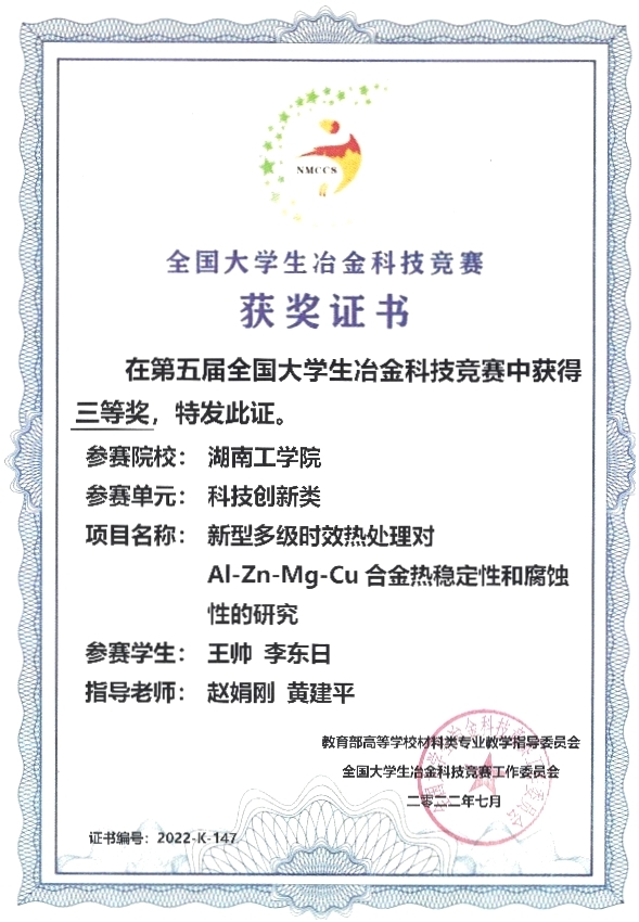 2022622日至30日由教育部高等学校材料类专业教学指导委员会主办的第五届全国大学生冶金科技竞赛在江苏科技大学进行。WilliamHill中文官方网站材料学院金属材料专业学生王帅李东日所组成的团队以“新型多级时效热处理对Al-Zn-Mg-Cu合金力学性能和腐蚀性能的影响”作为参赛作品,获得了本次比赛三等奖指导老师是赵娟刚和黄建平老师