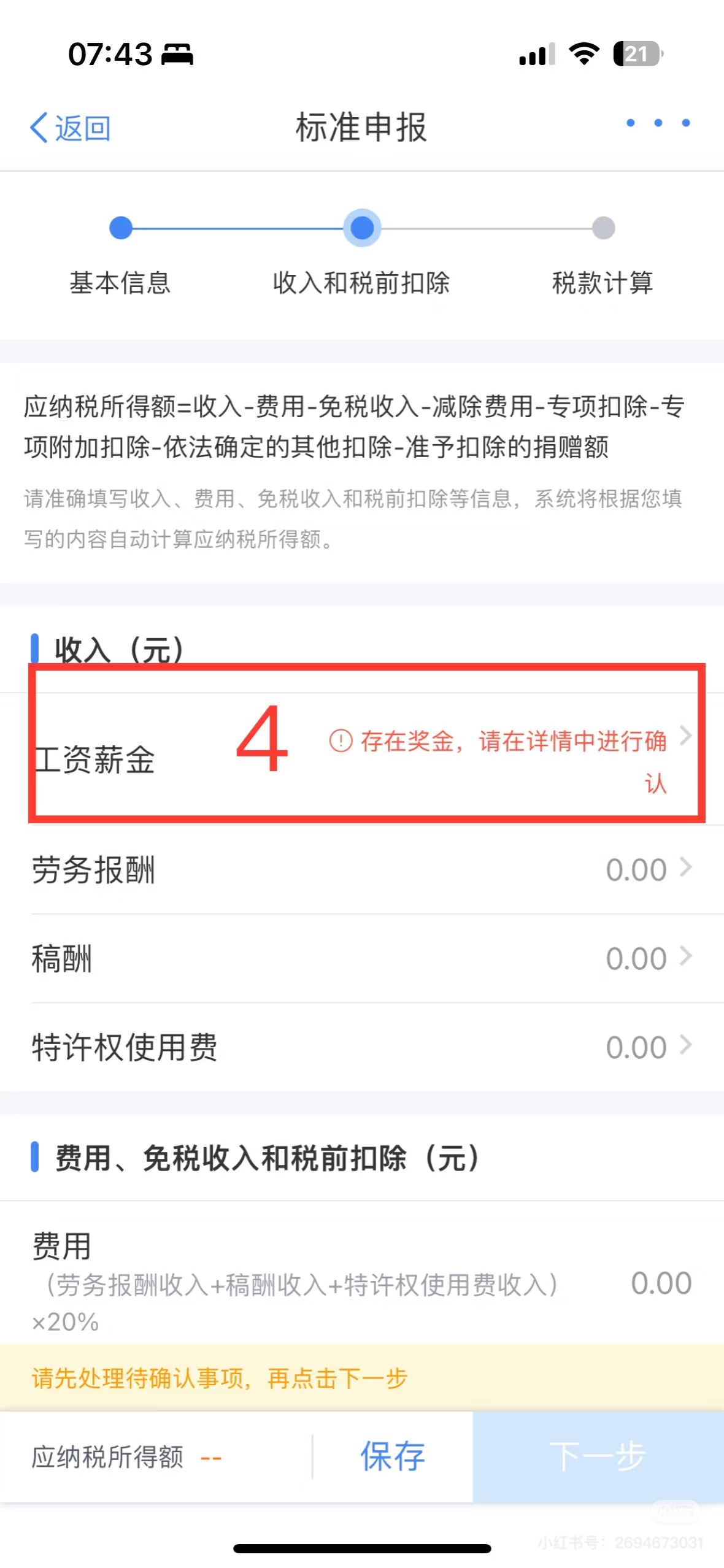 (5)核对收入和专项附加扣除扣除,若存在奖金,请选择【全年一次性资金】计税方式。