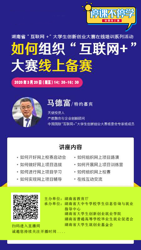 根据湖南省“互联网+”大学生创新创业大赛组委会工作要求,现发布第二次线上培训安排,请各二级学院创新创业大赛组委会成员、指导老师、拟参赛团队、创业孵化项目、省级及以上大学生创新创业项目负责人及指导老师准时观看。