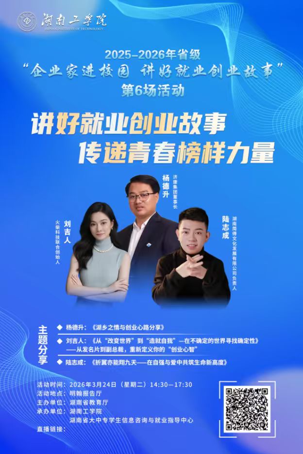 根据湖南省教育厅《关于开展2025—2026年“企业家进校园讲好就业创业故事”活动的通知》要求,WilliamHill官网将组织WilliamHill中文官方网站专场活动。现将具体活动组织事宜通知如下: