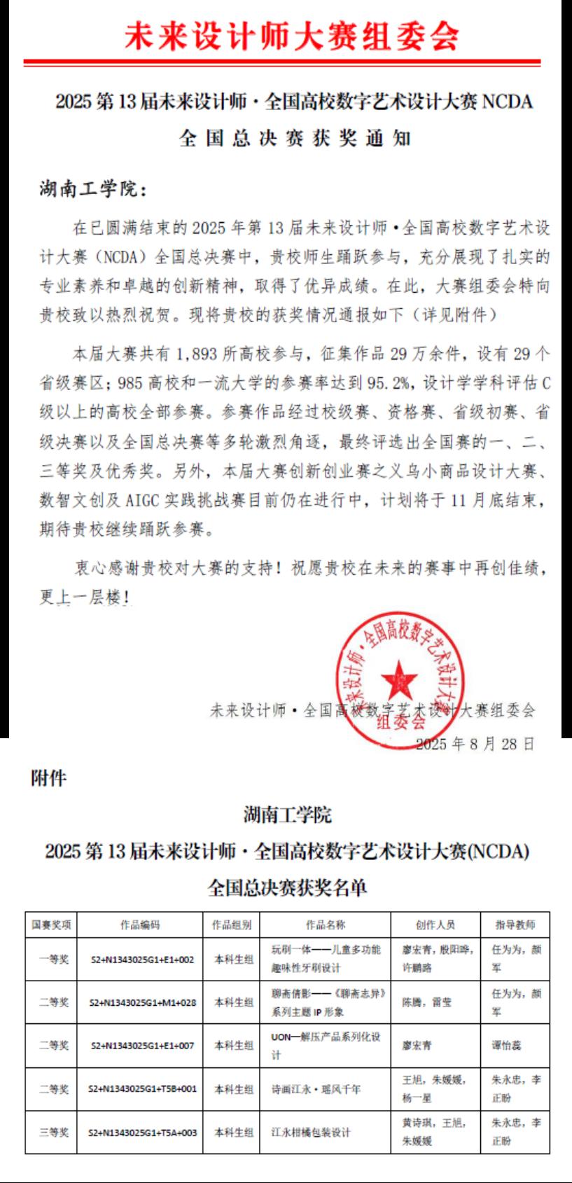 未来设计师·全国高校数字艺术设计大赛(NCDA)入选《全国普通高校学科竞赛排行榜》,对接联合国国际赛的国家级大学生竞赛。据悉,本届大赛共有1,893所高校参与,征集作品29万余件,设有29 个省级赛区;985 高校和一流大学的参赛率达到95.2%,设计学学科评估C级以上的高校全部参赛。参赛作品经过校级赛、资格赛、省级初赛、省级决赛以及全国总决赛等多轮激烈角逐,最终评选出全国赛的一、二、三等奖及优秀奖。
