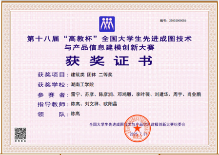 全国大学生先进成图技术与产品信息建模创新大赛是工程图学学科最高级别的国家级赛事,被誉为“图学界的奥林匹克”,位列2024年全国普通高校学科竞赛排行榜榜单第22位。经过层层选拔,我院学子24人参加湖南省预选赛,获得一等奖3项、二等奖5项、三等奖5项,12人晋级国赛。暑期经过为期1个月的集中训练和竞赛模拟,最终在全国大赛中获得一等奖1项、二等奖3项、三等奖6项以及建筑类团体二等奖。