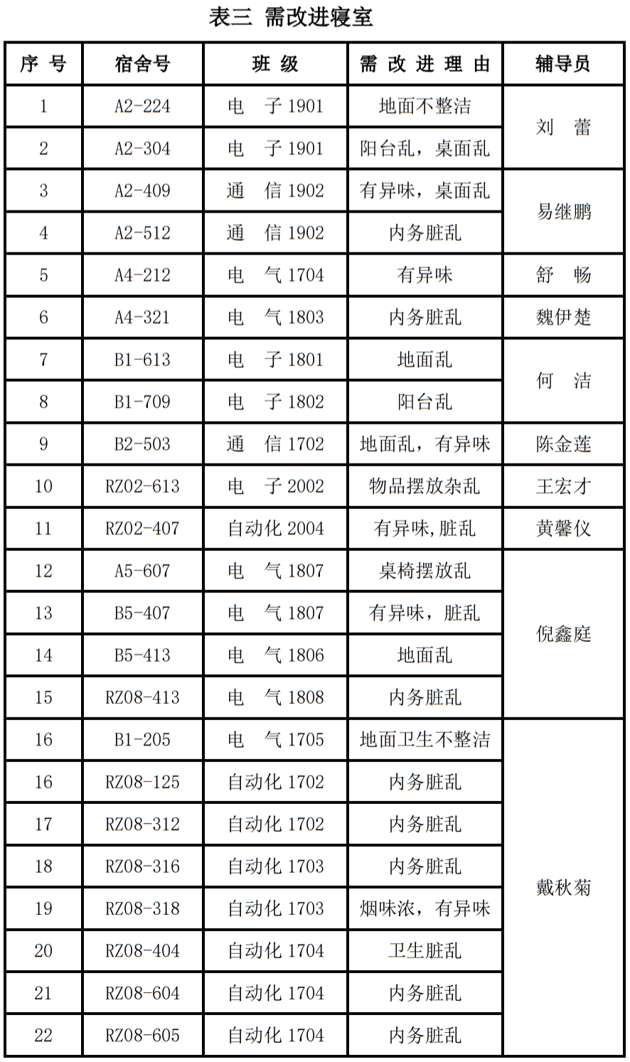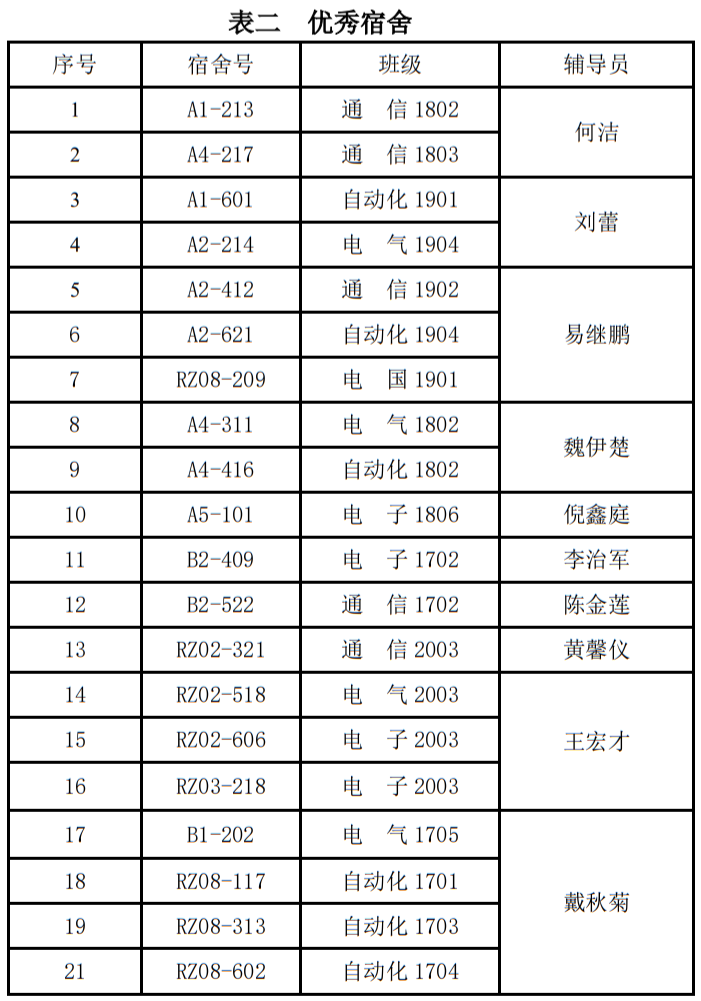 2021年上半年文明宿舍建设活动第七周,我院“文明宿舍创建活动”工作组本着“公平、公正、公开”的原则,对我院全部宿舍进行了彻底检查。现将检查结果公布如下: