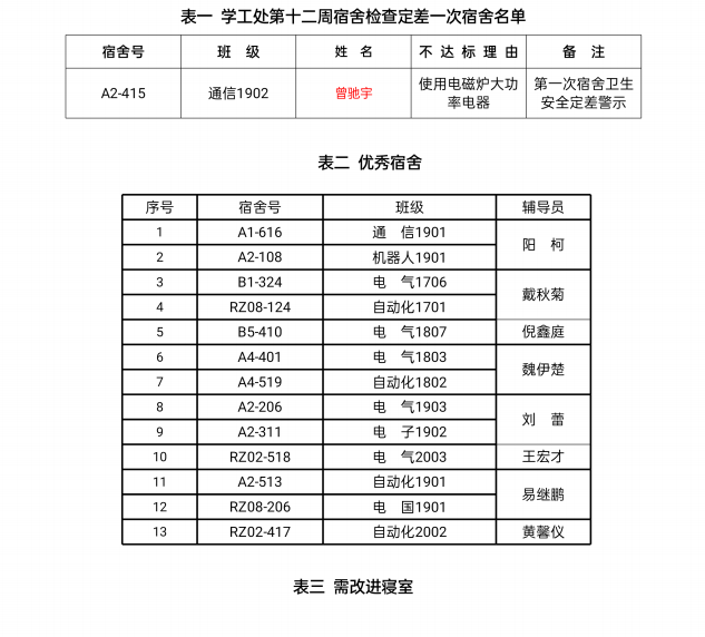 电气与信息工程学院文明宿舍建设活动第十三周检查结果