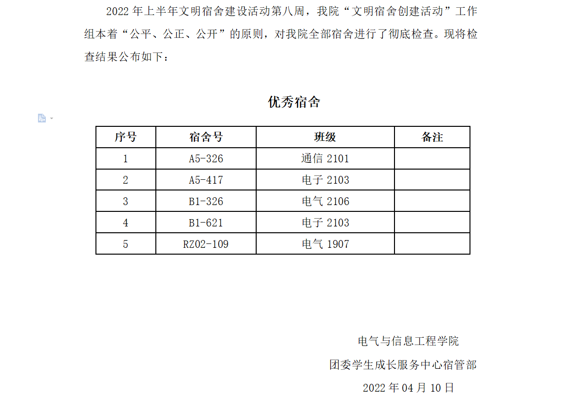 2022年上半年文明寝室创建第八周优秀寝室