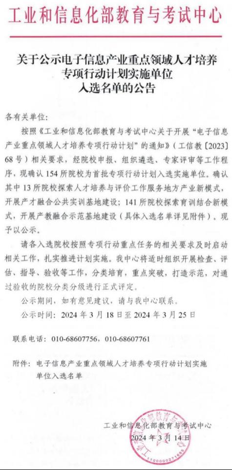 该计划是在工业和信息化部电子信息司、人事教育司,以及教育部高等学校电子信息类专业教学指导委员会、全国工业与信息化职业教育教学指导委员会的指导支持下,由工业和信息化部教育与考试中心发布的。该计划旨在培养电子信息产业高水平技术人才,促进产业链、教育链、人才链、创新链有机衔接,形成产、学、研、用相互促进、相互协同的人才培养格局,为推进新型工业化提供有力人才支撑,促进电子信息产业快速发展。