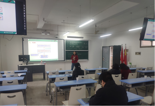 雷美艳老师主讲了《模拟电子技术》公开课,分别从课程简介、课程目标、考核方式、电子技术发展及应用及电子信息系统组成等方面进行了说课,并以“3.1放大电路的基础知识”内容进行了授课展示。雷老师采用PPT课件和黑板板书相结合,板书工整漂亮,理论联系实验项目和工程实例,体现工程思维的培养,教学设计合理,教学方法多样,课程思政收放自如。课后,教师们对课程提出了持续改进的建设性意见,可以适当调整课堂节奏,部分内容讲解可适当精简,进一步的提升课堂教学质量。