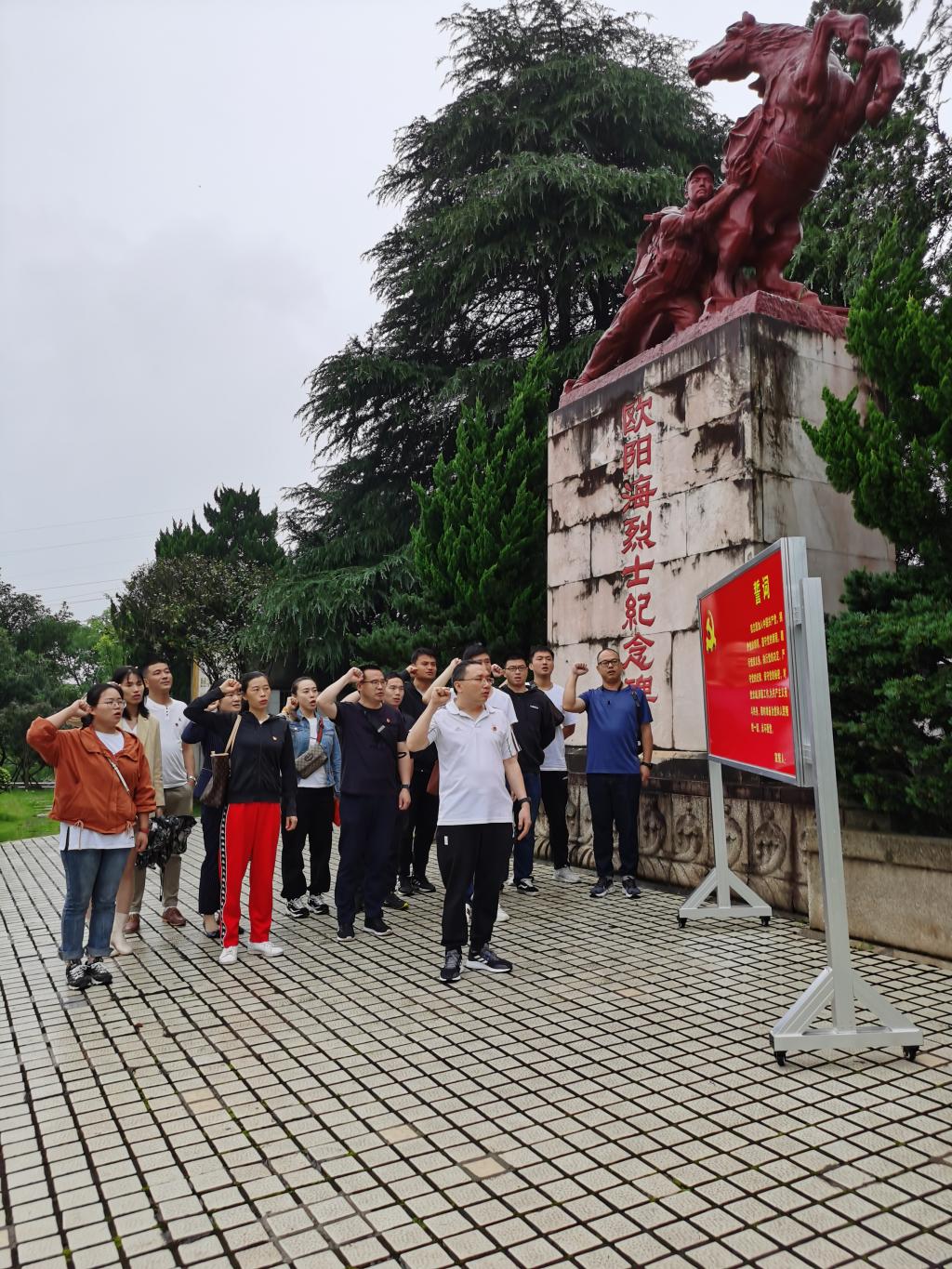 参观学习后,党总支书记余忠为全体党员讲了一堂生动的党课。他带领大家回顾了党的光辉历史,从百年党史中汲取奋进的力量,激励党员干部继承和发扬党的光荣传统,牢记初心使命。学史崇德,忠诚于党的信仰,厚植为民情怀,树牢群众观点,站稳群众立场,以及执政为民。本次党课学习开启了党史学习“学史崇德”的新阶段。党课学习完成后,余忠带领大家在欧阳海烈士“推马救列车”的塑像前,重温入党誓词,庄严宣誓。