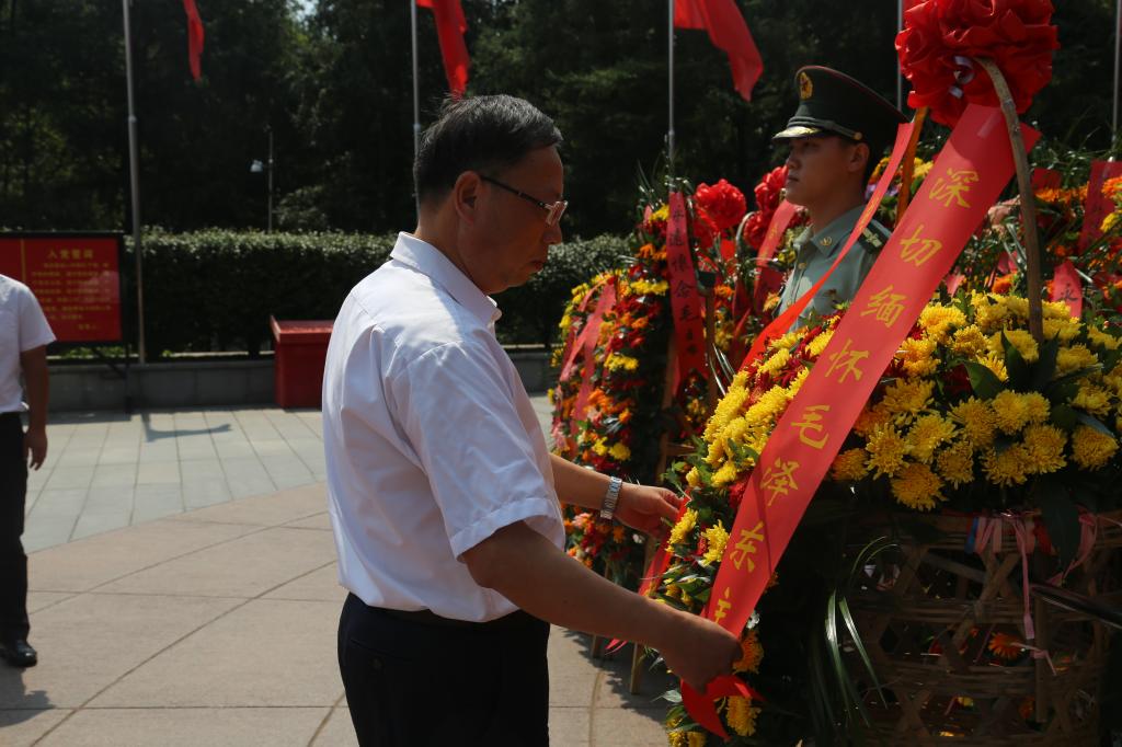 在毛主席铜像广场,谢国保、罗建华等校领导面向毛主席铜像列队肃立,谢国保向毛主席铜像敬献花篮,仔细整理花篮缎带,全体校领导向主席铜像鞠躬致敬,面对党旗,谢国保带领校领导一起重温入党誓词。