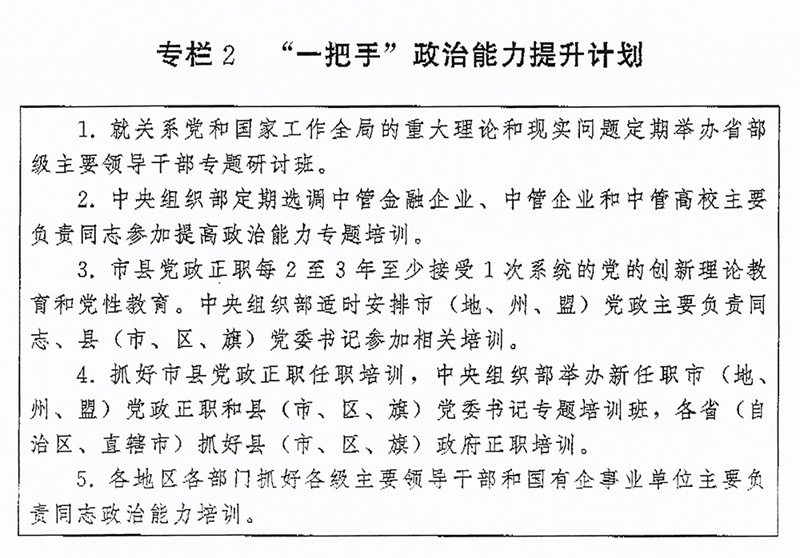 (二)突出“关键少数”政治训练。坚持把政治训练贯穿干部成长全周期,使干部的政治素养、政治能力与担负的领导职责相匹配。强化“一把手”政治培训,有计划地选调地方、部门、国有企事业单位主要负责同志到党校(行政学院)、干部学院参加专题培训。实施“一把手”政治能力提升计划(专栏2)。省(自治区、直辖市)、市(地、州、盟)、县(市、区、旗)党政领导班子成员每2至3年到党校(行政学院)、干部学院至少接受1次系统的党的创新理论教育和党性教育,5年内累计不少于2个月。围绕提高政治能力和领导能力,加强机关司局长、处长任职培训。重视对女干部、少数民族干部、党外干部等的政治培训。加强对高层次人才的政治引领,中央组织部会同有关单位每年组织一定数量人才开展国情研修。