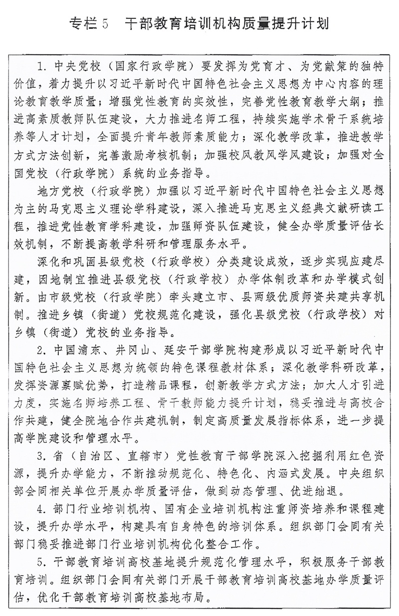 (一)培训机构建设。推进各级党校(行政学院)建设,以教学督导、师资培养、质量评估为重点,强化上级党校(行政学院)对下级党校(行政学院)的业务指导,不断提高办学水平。推进县级党校(行政学校)分类建设。加强社会主义学院建设。进一步提升部门行业培训机构、国有企业培训机构办学质量。加强对干部教育培训高校基地、基层干部教育培训机构办学指导。开展党校(行政学院)、省(自治区、直辖市)党性教育干部学院、干部教育培训高校基地办学质量评估。加强各类党员干部教育培训机构规范管理,严控新设以党员干部为培训对象的培训机构。支持地方、部门联合开展培训,鼓励干部教育培训机构开展区域协作交流,推动优质培训资源共享。实施干部教育培训机构质量提升计划(专栏5)。