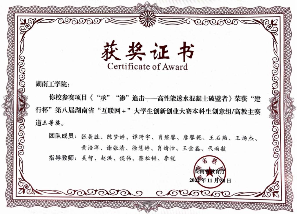 自研究以来,本项目获得一系列成果,获得全国透水混凝设计大赛1等奖1项,混凝土设计大赛二等奖3项,实践技能奖1项,授权高透水、高强度透水混凝土发明专利1项,相关科技论文1篇,参编透水混凝土行业标准1项。本项目初步与广西凯骏科技有限公司达成意向,产品在强度、透水率等性能,质量稳定性,耐久性以及经济性表现突出,具有较高的社会认可度。