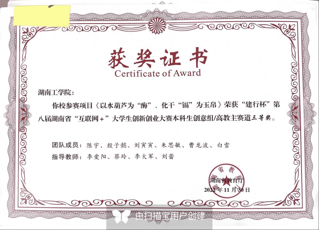 省赛三等奖:以水葫芦为“酶”,化干“镉”为玉帛