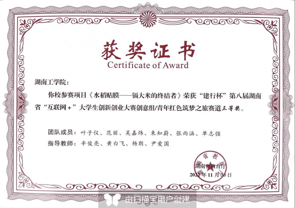 省赛三等奖:水稻贴膜——镉大米的终结者