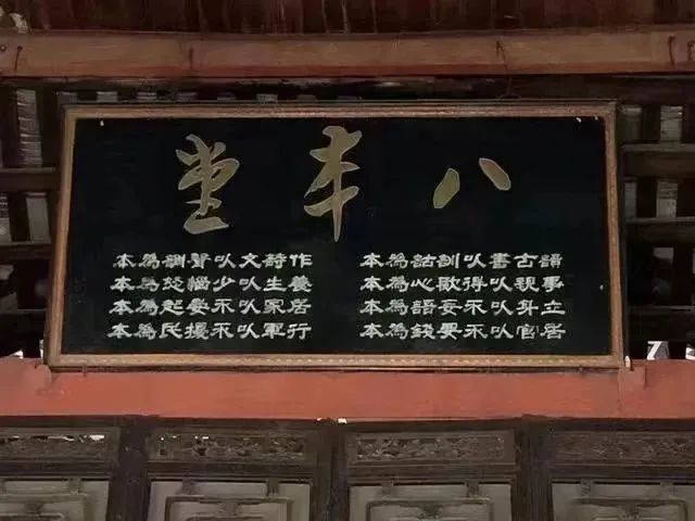 走进主楼大厅,西面神台上方横梁上悬挂着一块巨大的黑底金字匾,匾的正中是曾国藩亲笔书写的“八本堂”三个楷书大字;下方是其子曾纪泽用隶书写的“八本家训”:读古书以训诂为本,作诗文以声调为本,事亲以得欢心为本,养生以少恼怒为本,立身以不妄语为本,居家以不晏起为本,居官以不要钱为本,行军以不扰民为本。