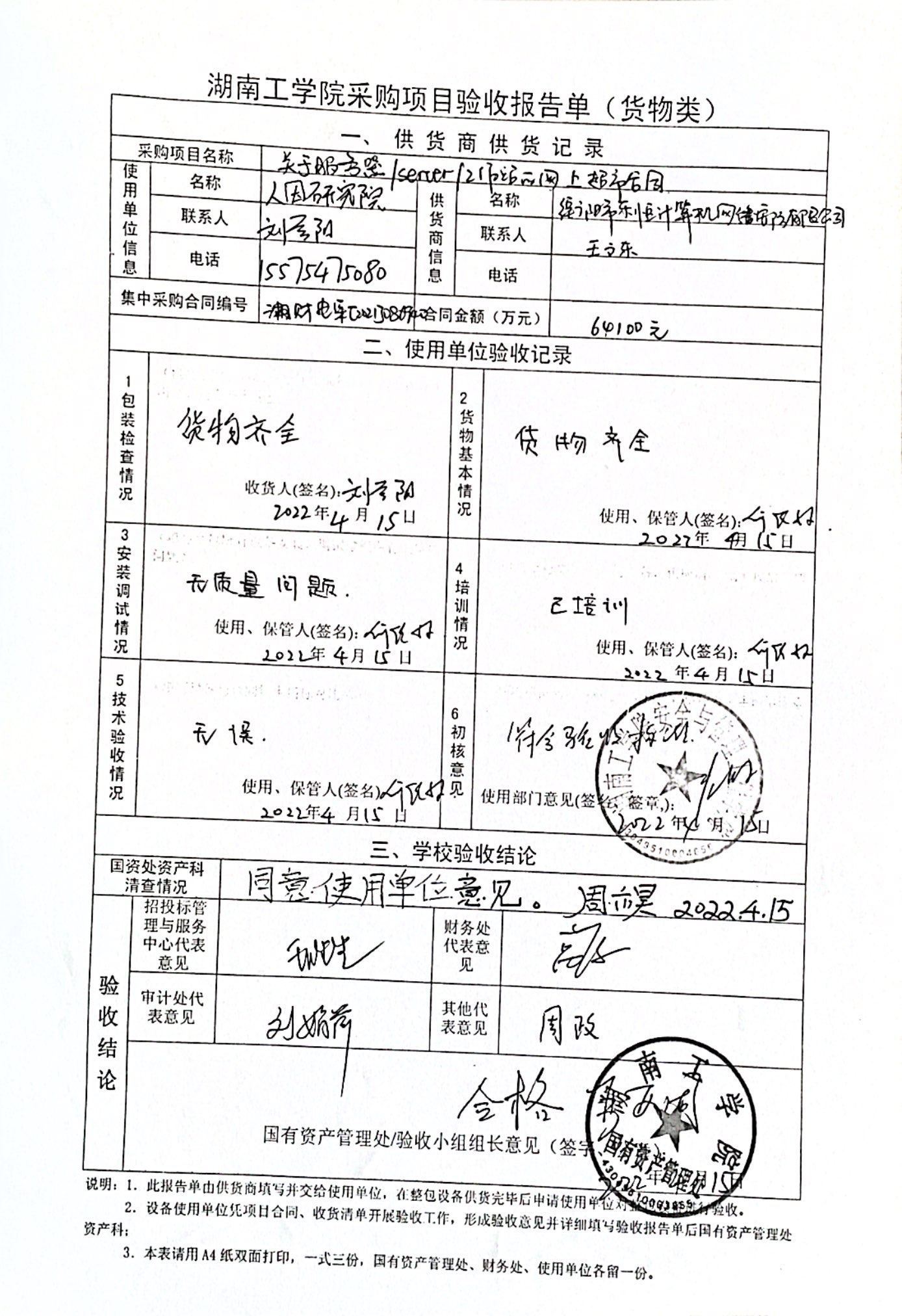 根据国有资产管理处对采购项目的验收安排,2022年4月15日国有资产管理处组织招投标管理与服务中心、审计处、财务处、学科建设与发展规划处以及使用部门代表对供应商的货品进行现场验收。