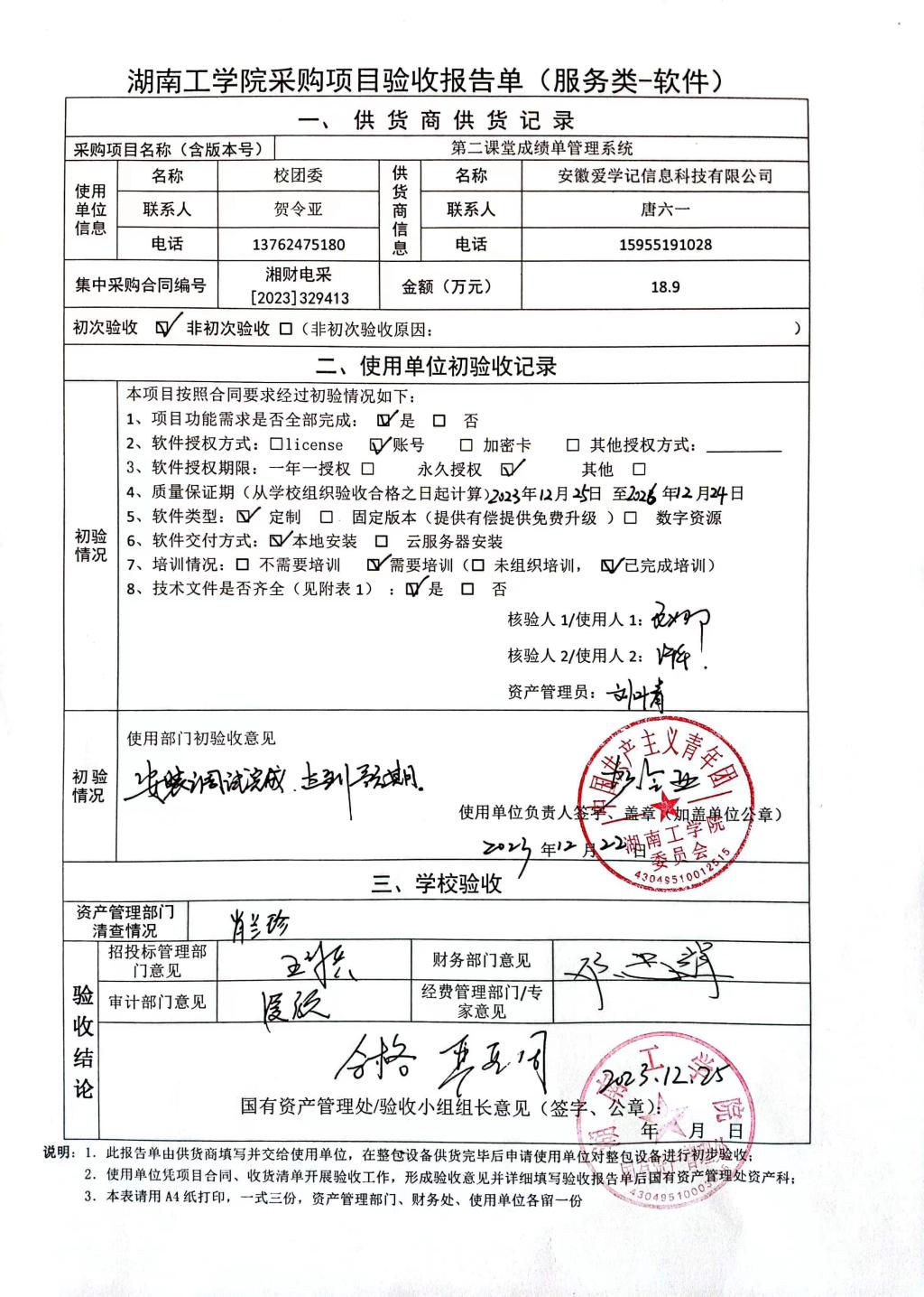 2023年12月关于湘财电采【2023】329413号项目验收情况公告