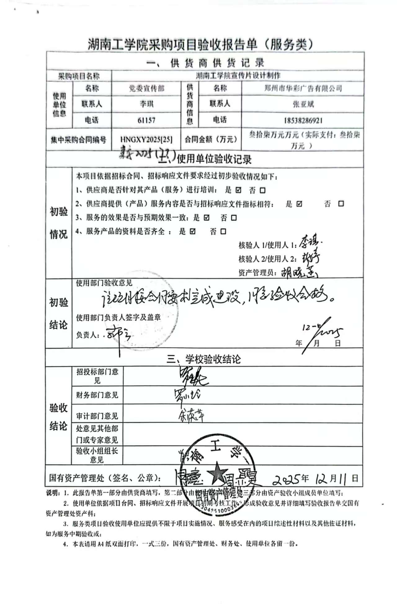 2025年12月关于HNGXY2025【25】号 建字2025【7】号采购项目验收情况公告