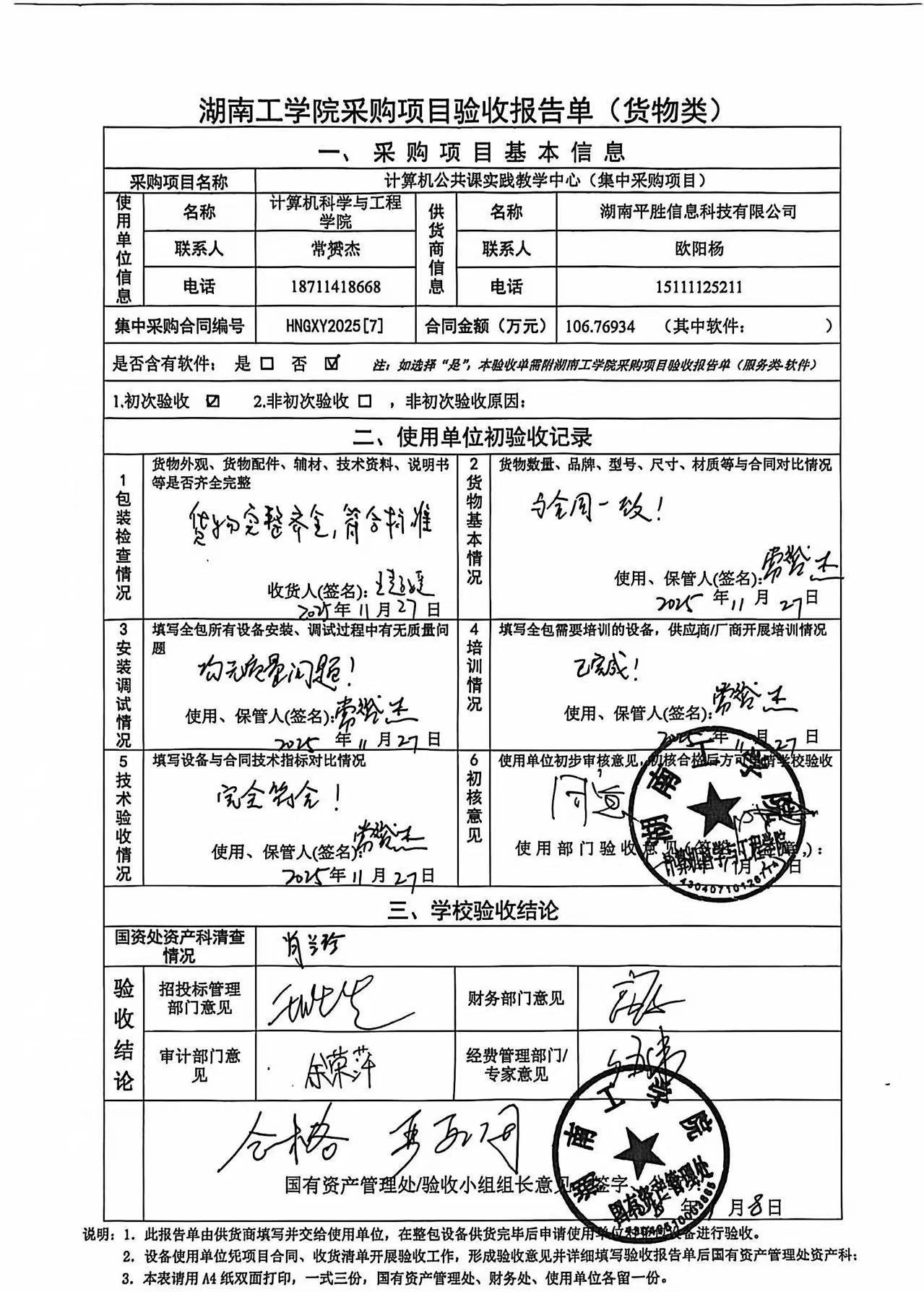 2025年10月关于HNGXY2025【7】号 购字2025【1】号采购项目验收情况公告