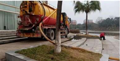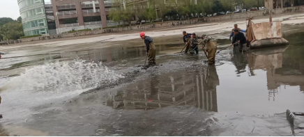清淤施工先将湖水抽排近三分之一后,暂停排水,挖掘周边淤泥并转运,然后操作高压泵将湖内的周边淤泥冲洗,用大型清淤车吸运及污水泵抽排淤泥水,再启动抽水泵抽排湖水,如此反复抽水、清淤、转运、冲洗、清淤车吸运,最终将淤泥清理干净。