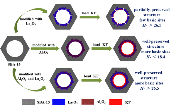 (2)系统探究了介孔固体强碱KF/Al-La@SBA-15中Al/La摩尔比对其结构和性能的影响。Al物种的加入,能够明显改变La物种在SBA-15介孔孔道中的分散行为;随着Al含量的增多,其比表面积、孔容及平均孔径均有所增大。而催化活性随着Al添加比例的增大,呈现先增后减的趋势。