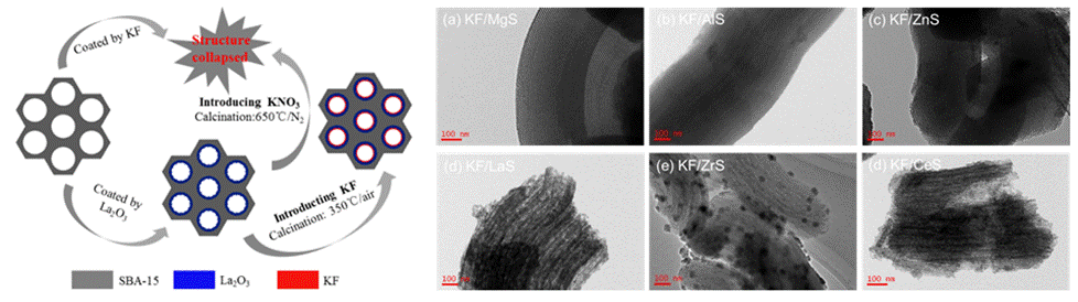 通过CTAB-P123双模板剂的策略,将易团聚的Ce物种引入到SBA-15的框架中,可改变载体的表面能,有利于引入M (M=Al, Mg, Zr, Zn)金属氧化物在其表面的分散,所制备的KF/M@Ce-SBA-15的介孔结构比对应的KF/M-SBA-15与KF/Ce-SBA-15有序度高,且产生了超强碱活性位点。利用此种方法可有效解决部分金属氧化物在载体上团聚而影响催化活性的问题。