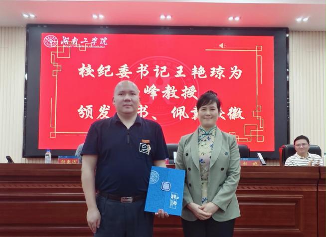 在热烈的掌声中,王艳琼为李峰颁发客座教授聘书并佩戴校徽。