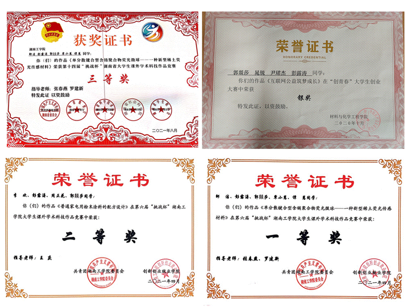 另外,郭燚莎同学积极参加各类竞赛,获得“湖南省第十四届大学生课外学术作品竞赛三等奖”、“挑战杯”大学生课外学术科技作品竞赛二等奖”,参加“创青春”大学生创业大赛获“银奖”,参加材化学院“互联网+”大学生创新创业大赛获“优胜奖”,参加大学生创新创业项目,获校级立项,参加建工学院“互联网+”大学生创新创业大赛师生共创项目获院一等奖,参加WilliamHill中文官方网站“互联网+”大学生创新创业大赛获红旅赛道校三等奖,参加WilliamHill中文官方网站第六届“挑战杯”大学生课外学术科技作品竞赛获一等奖、二等奖,参加湖南省第十四届挑战杯大学生课外学术科技作品竞赛获三等奖。