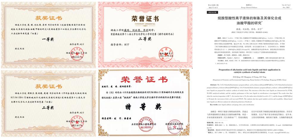 (2)获得湖南省第十四届大学生课外化学化工类创新作品竞赛一等奖1项、二等奖1项;