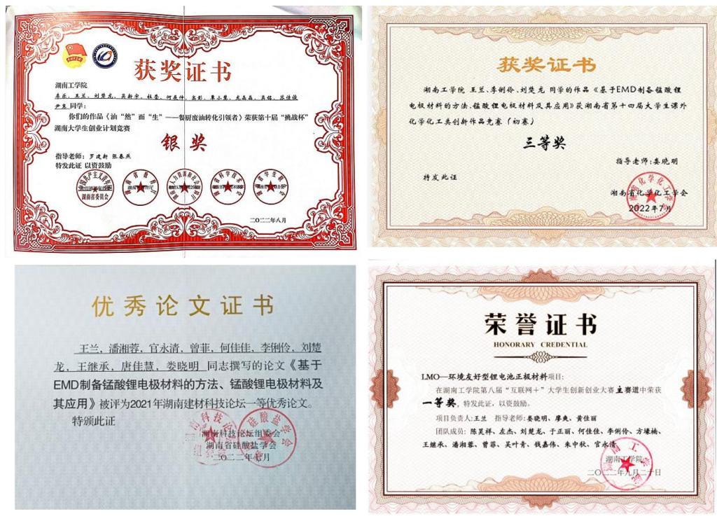 另外,王兰同学刻苦钻研,她尝试以商品电解二氧化锰(EMD)和单水氢氧化锂为原料,在老师的指导下,通过简单的步骤制备了结晶度高,形貌一致性与循环稳定性好、能够满足动力电池需要的锰酸锂电极材料颗粒,工艺步骤简单、反应周期短、能耗及生产成本低、更适于工业化实施和应用。相关成果于20225月成功申请国家发明专利《基于EMD制备锰酸锂电极材料的方法、锰酸锂电极材料及其应用》(CN114436336A),相关成果于20229月在国家级大学生创新训练项目立项(202211528025),并获得2021年湖南省硅酸盐学会建材科技论坛一等优秀论文。