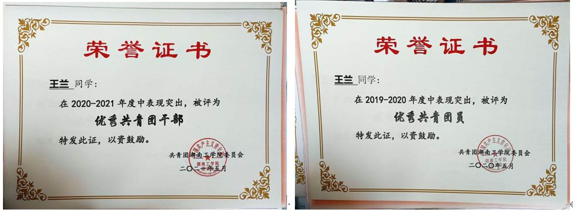 王兰同学也曾参加大学生暑期三下乡活动,在2021年大学生暑期“三下乡”之“赴湖南省衡阳市衡山县云开镇农民运动纪念馆”暑假社会实践团调研的那段时间里,深入群众,与当地居民交流沟通,取得了良好成果和较好反响。此外,她还经常在课余时间积极参加志愿者活动,与青年志愿者协会一同去往敬老院活动,关爱老人,陪爷爷奶奶聊天,共同度过美好的时光;高铁站志愿活动,为创建美好城市献出自己的一份力;湘江行净滩活动,帮助奔腾的湘江变得更加美丽整洁;岳屏山抗战纪念城祭奠抗日英烈活动,缅怀抗战英烈和死难同胞;还有共享单车整理活动、校园队等。疫情期间,她积极响应国家号召,戴口罩,勤洗手,关爱他人。同时,她也积极参加党日、团日活动,在庆祝建党一百周年,辩响青春主题辩论赛中,获得“优秀辩手”,“最佳团队”荣誉称号。