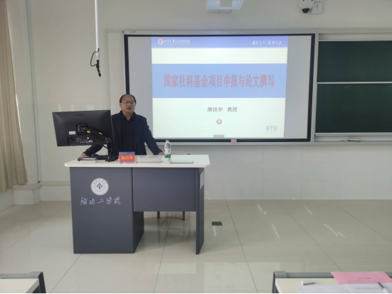 下午在社科楼408智慧教室,颜佳华教授作了题为《国家社科基金申报与高质量论文撰写》的辅导报告。颜教授结合自身多年国家社科基金项目评审指导经验,详细解读申报通知文件,围绕标书写作的各部分内容,以成功立项项目为范例逐一强调注意事项、分析关注重点、推荐优质资源,鼓励各位老师早做准备、注意技巧、规避问题、敢想敢做、加强模仿,实现量变到质变的跃升。