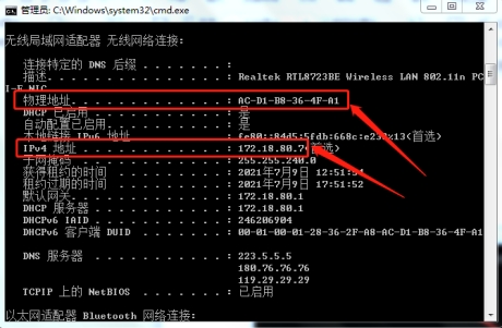 3. IP地址和MAC地址:点击电脑左下角开始—输入cmd—输入命令ipconfig -all,运行可查,如图,其中IP地址为图中IPv4地址、MAC地址为图中物理地址,多个网卡以有ip在用的为准,多个在用也可都填。